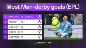 On the blue side of Manchester, the derby only strengthened Erling Haaland’s case as one of the most ruthless strikers in history. He has now scored eight goals in just six Premier League derbies against United, matching the numbers of Wayne Rooney and Sergio Agüero in far fewer games.