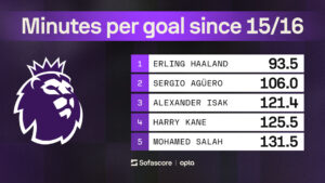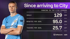 Since joining City, Haaland has scored 129 goals, averaging a goal every 95 minutes, and requiring just 25.7 touches per goal – the most efficient striker in Europe. In Premier League history since 2015/16, nobody comes close: Haaland averages a goal every 93.5 minutes, far ahead of Agüero, Isak, Kane and Salah.