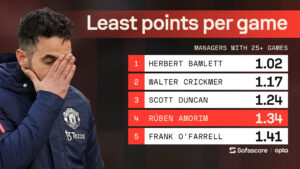 Rúben Amorim is now statistically one of the least successful managers in United’s modern history. With just 1.34 points per game, he holds the worst record for any United boss with 25+ games since the 1940s. In the Premier League era, he ranks 137th out of 177 managers.
